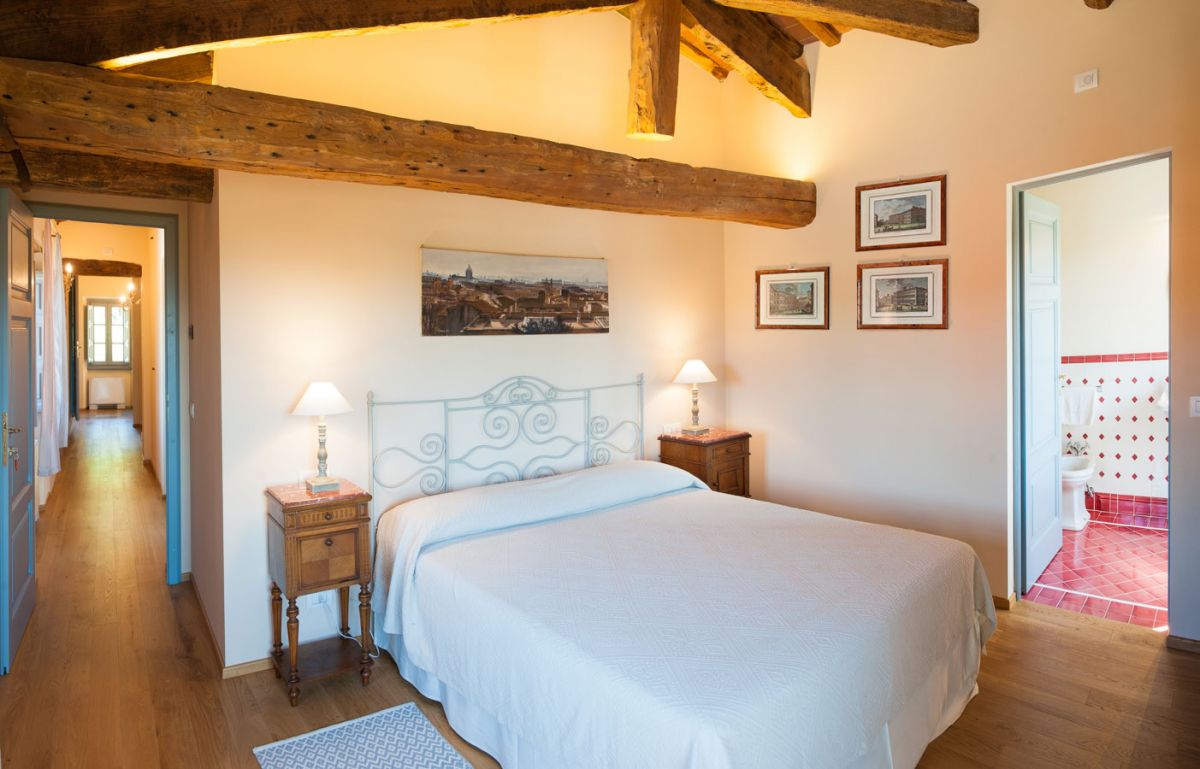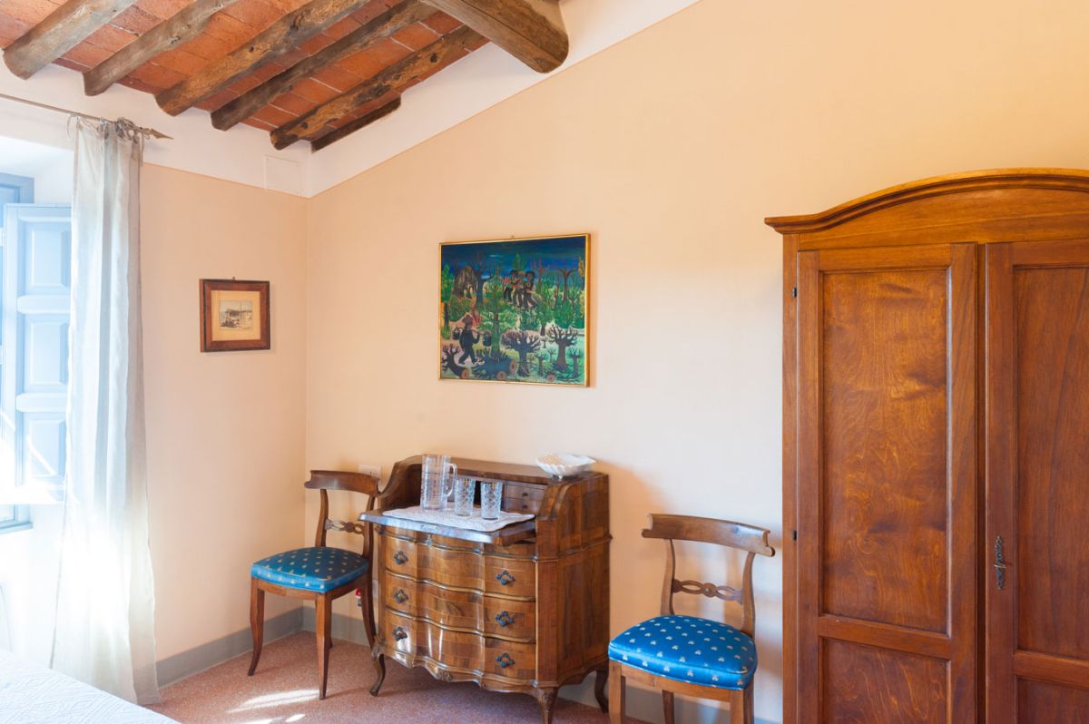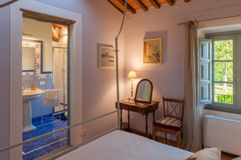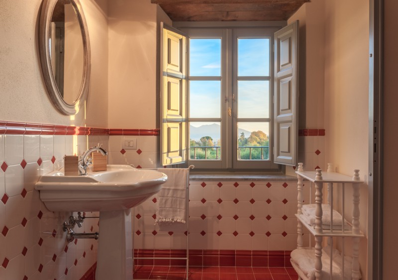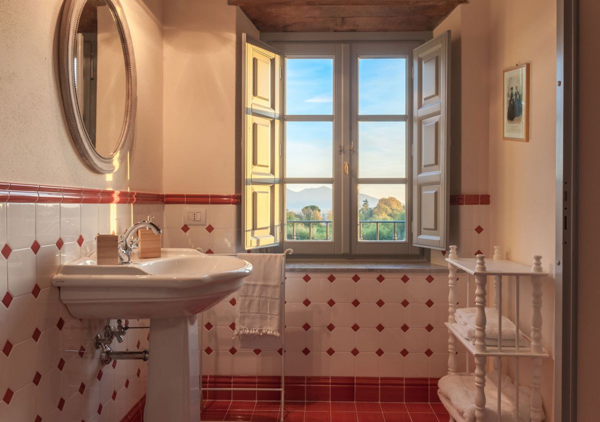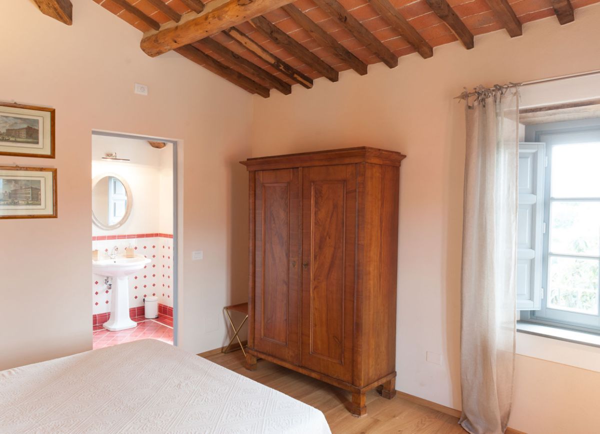 The rooms at Arancera are designed as bright, peaceful retreats where the understated elegance of the historic Lucchese villas meets contemporary comfort. Each space reflects the Tuscan tradition through authentic details: exposed wooden beams, handcrafted wooden window frames, a refined blend of antique furnishings and modern lines, and en-suite bathrooms decorated with hand-painted tiles created by master artisans.