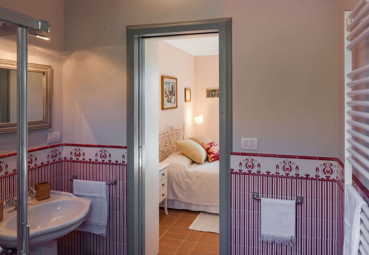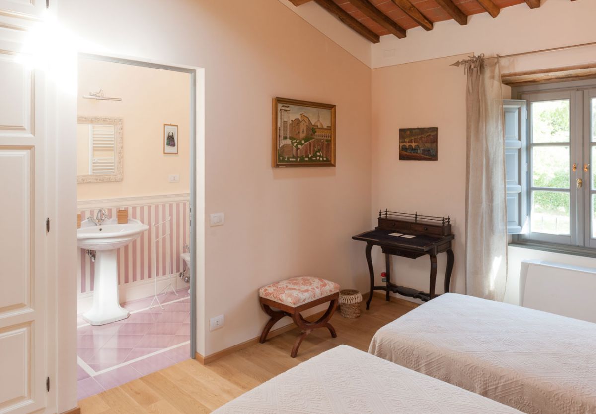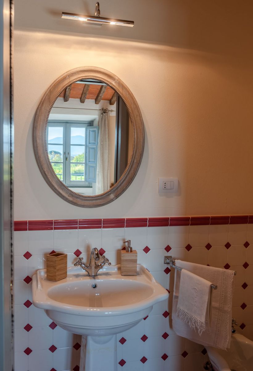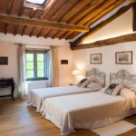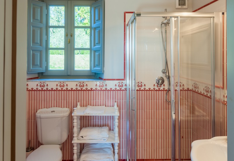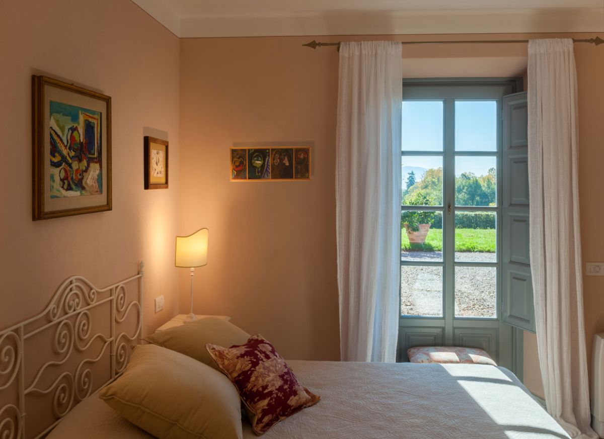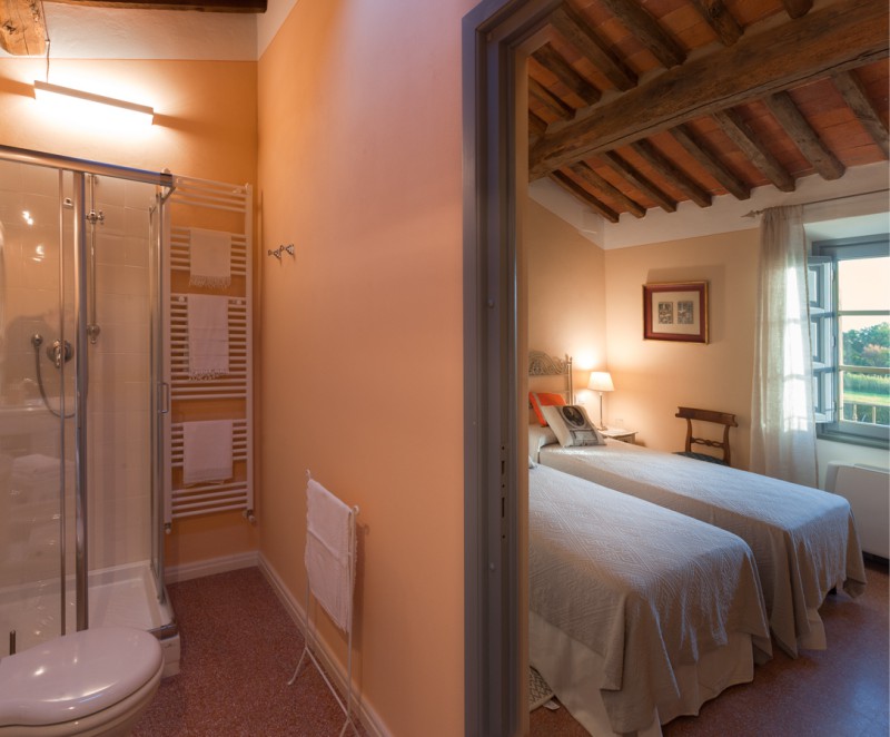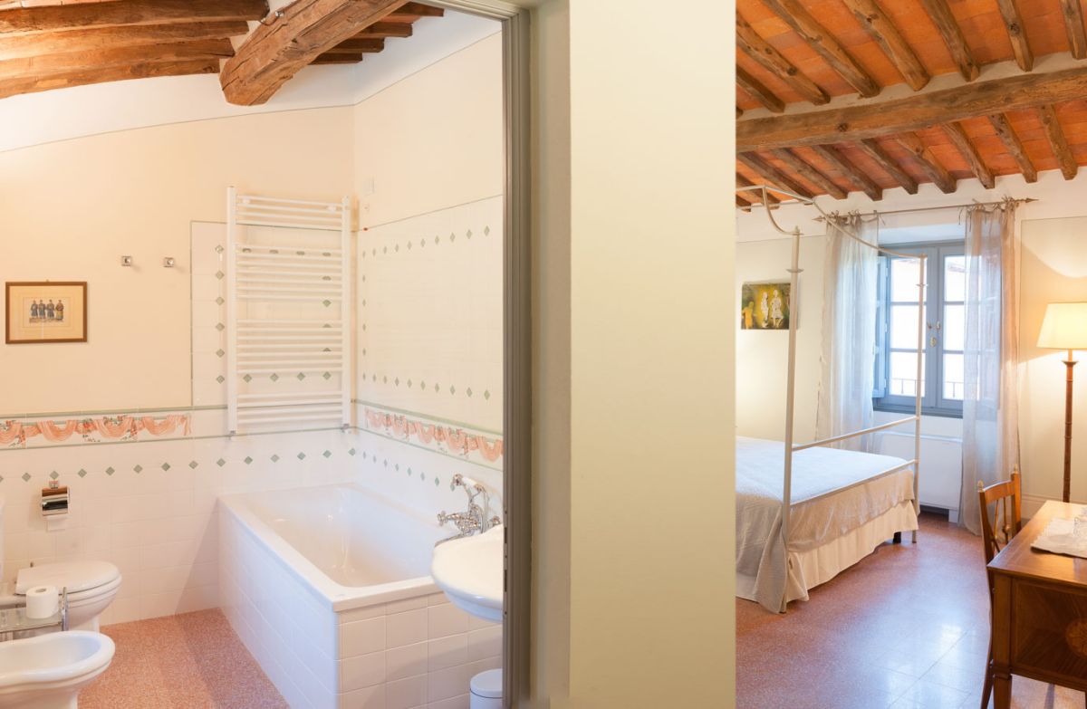 The rooms at Arancera are designed as bright, peaceful retreats where the understated elegance of the historic Lucchese villas meets contemporary comfort. Each space reflects the Tuscan tradition through authentic details: exposed wooden beams, handcrafted wooden window frames, a refined blend of antique furnishings and modern lines, and en-suite bathrooms decorated with hand-painted tiles created by master artisans.