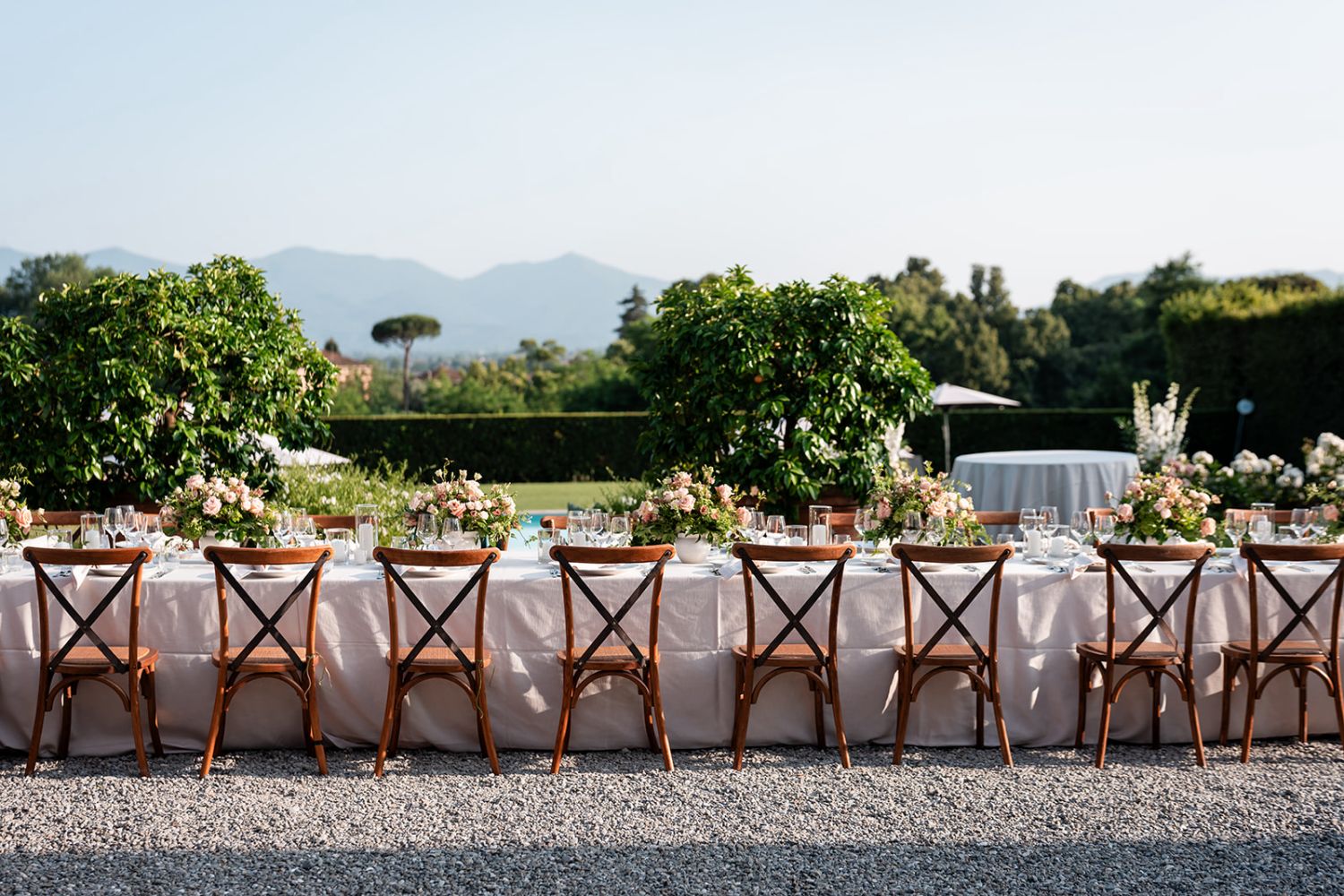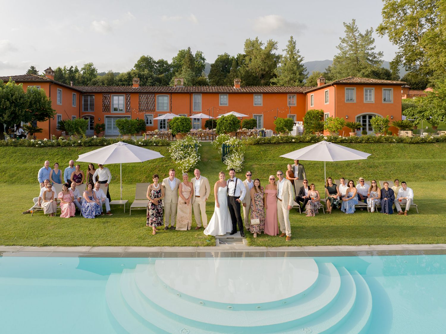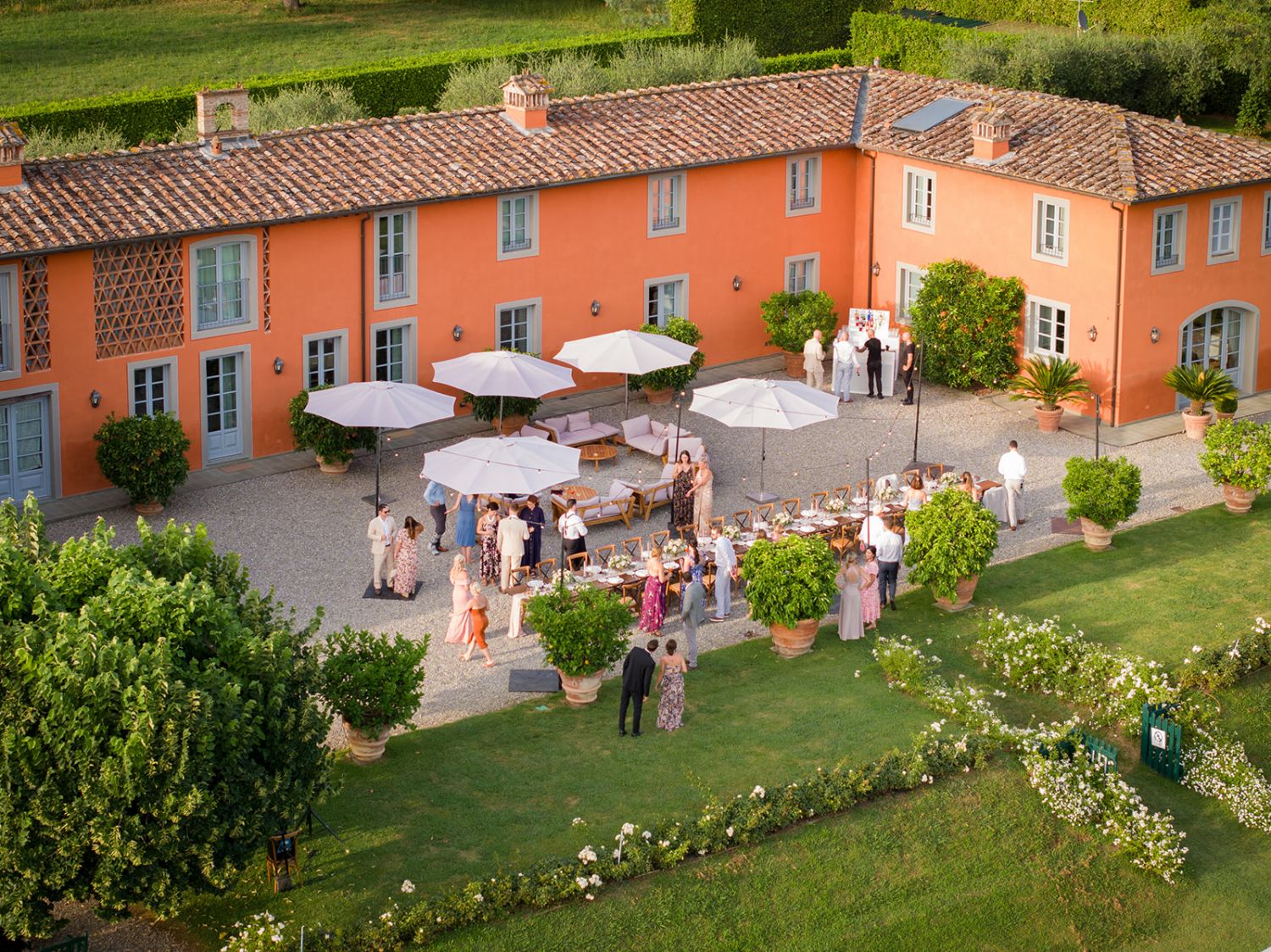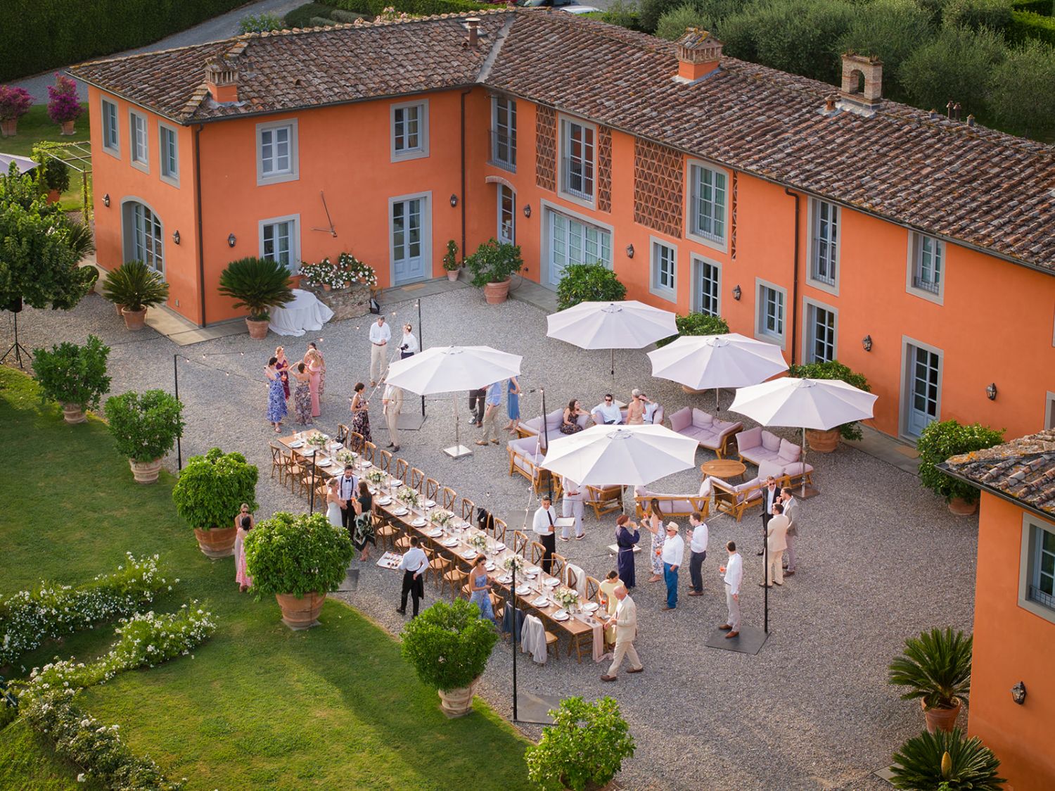 Getting married at Arancera means celebrating in an intimate and luminous setting, surrounded by the Tuscan countryside, with sweeping views over Lucca and the mountains toward Pisa. The villa becomes your private home for the celebration, a place to gather with the people you love and create memories that unfold naturally from ceremony to evening party.