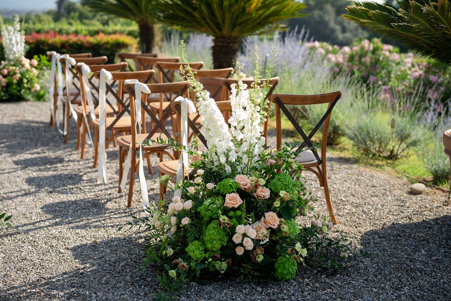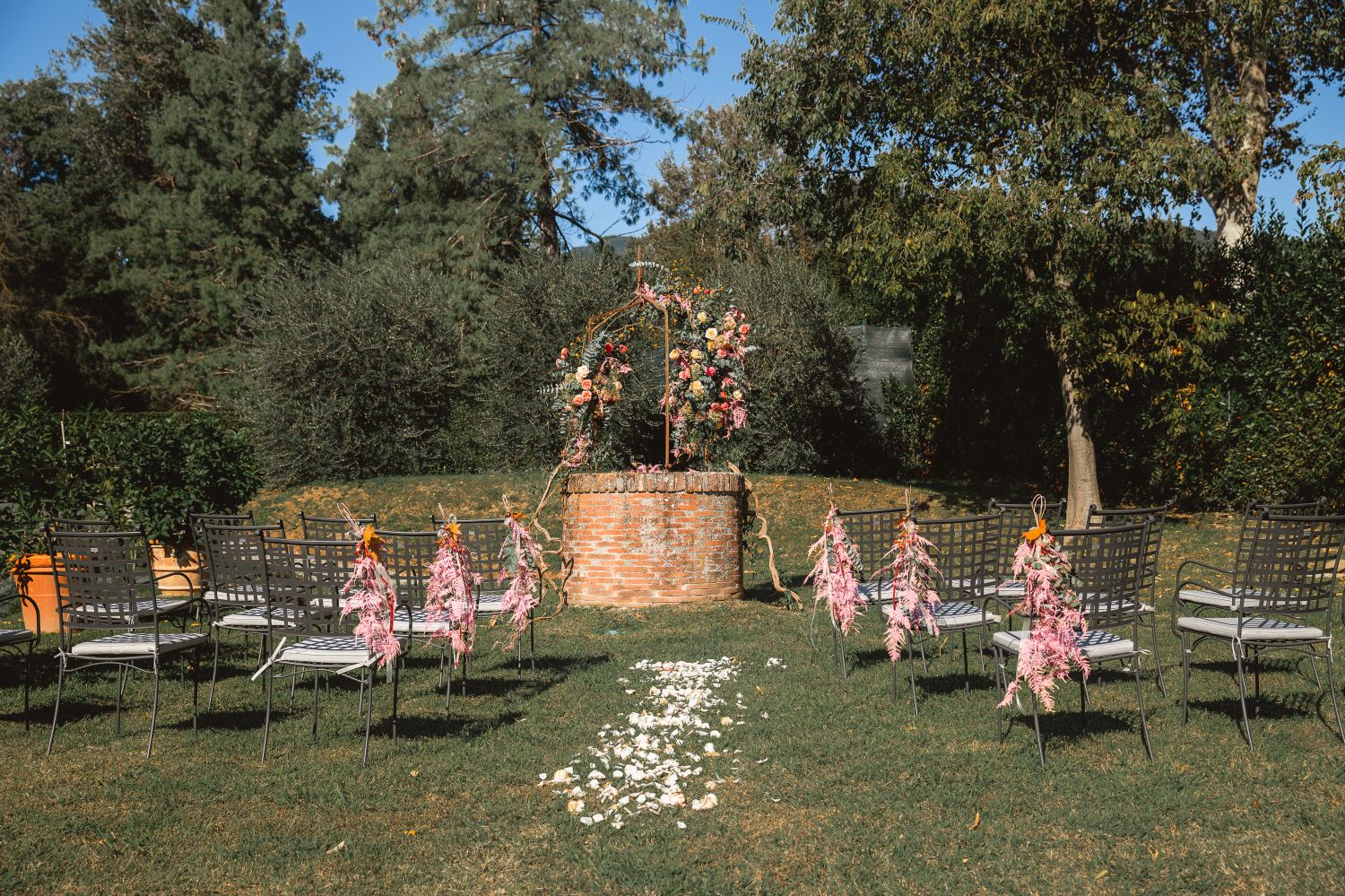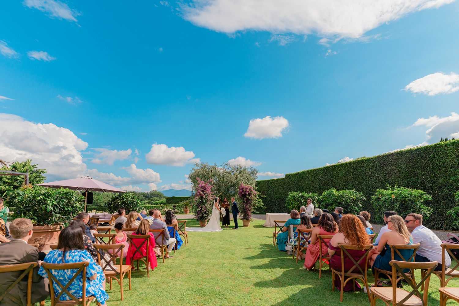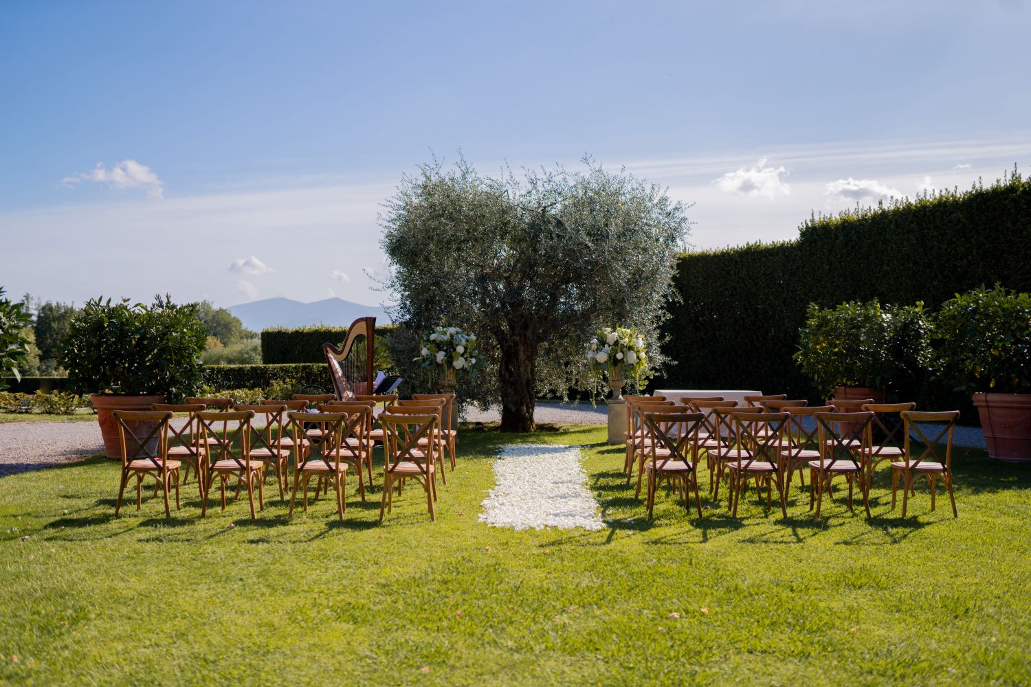 The gardens wrap around the Villa, offering a variety of beautiful settings for your special day. An ancient well, a majestic olive tree framed by citrus pots and bougainvillaea, and a white wisteria pergola provide romantic backdrops for ceremonies and aperitivos. An elevated panoramic terrace overlooking the pool and the rolling landscape is ideal for outdoor vows or a stylish cocktail reception.
